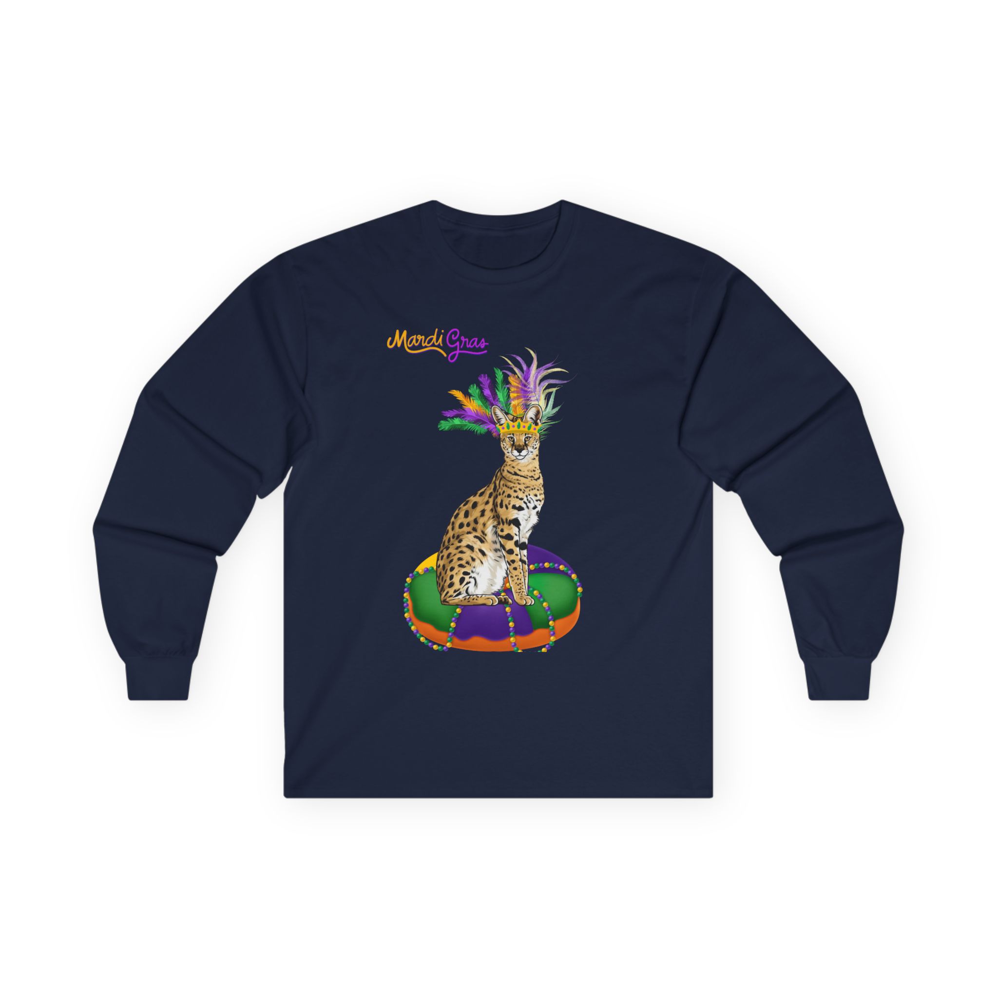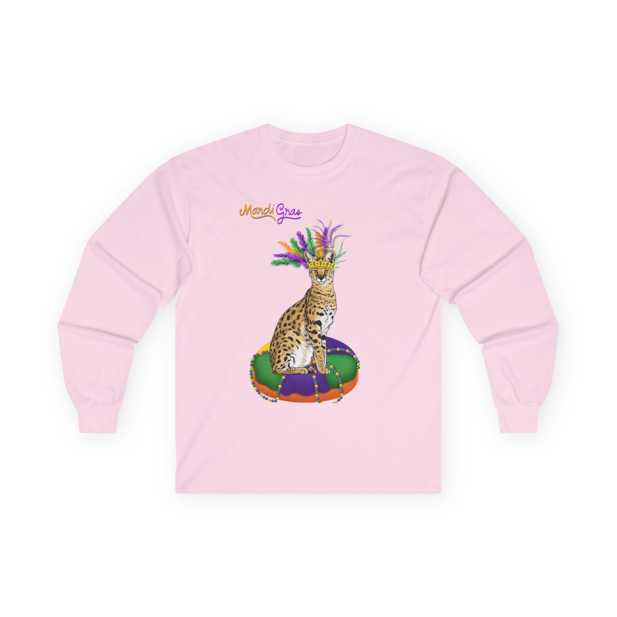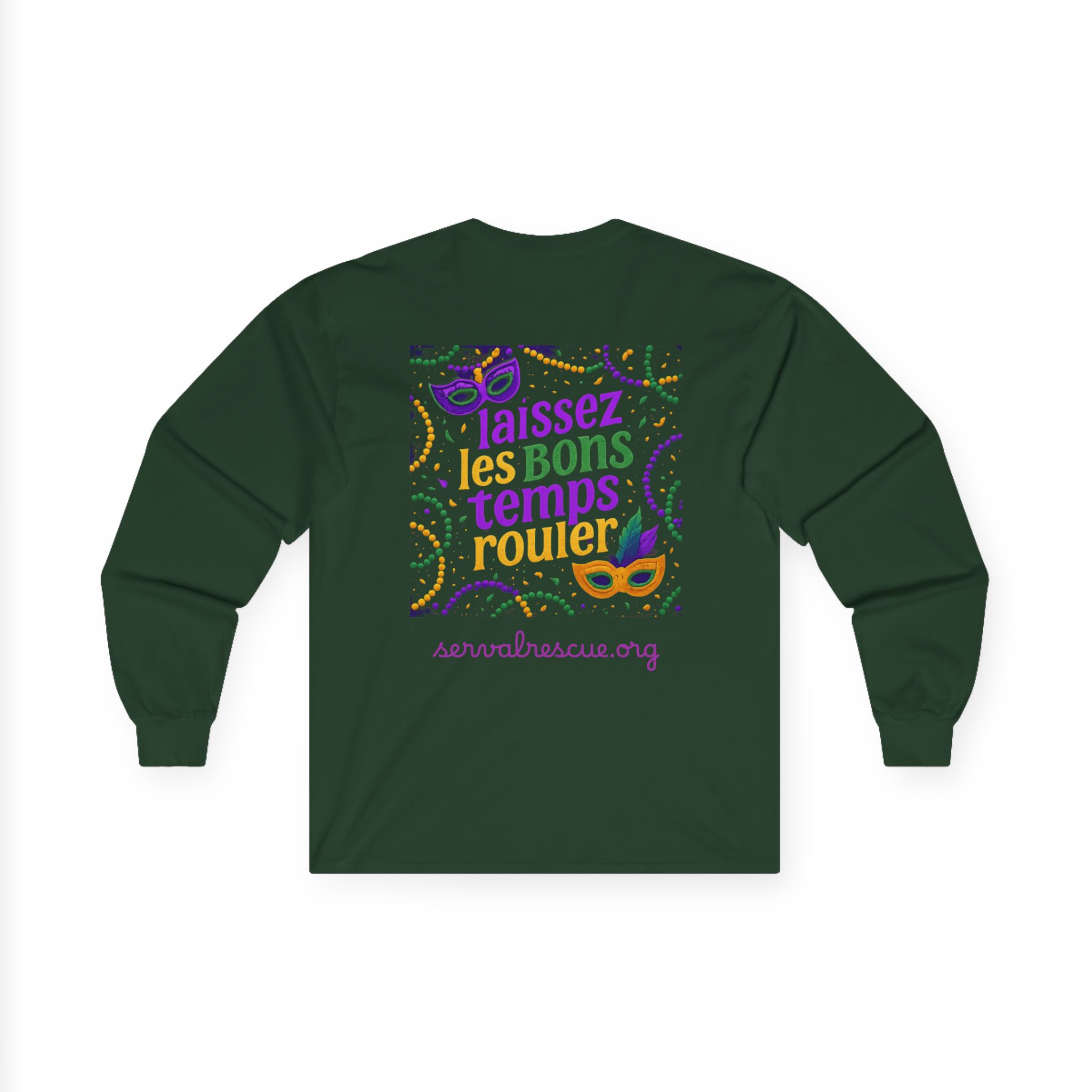 This long sleeve tee wraps you in the easy, celebratory spirit of Mardi Gras. The front shows a jewel-toned square with “Laissez Les Bons Temps Rouler” in warm golds and purples; the back repeats the phrase surrounded by playful masks, confetti and swirls. The medium-weight cotton feels substantial and a little vintage, grounding the bright design with a lived-in comfort. Wear it to a parade, a casual night out, or when you want to bring a bit of carnival energy to an ordinary day. The classic fit layers neatly under a jacket, while the ribbed collar and taped shoulders keep the shape through repeated wear. Runs a bit small — size up if you prefer a relaxed, roomy fit.
